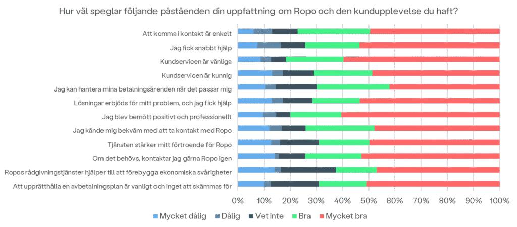 - Empatisk och respektfull kundservice: Respondenter beskrev konsekvent Ropos kundservice som vänlig, tålmodig och förstående. Många kände sig lyssnade på som människor.