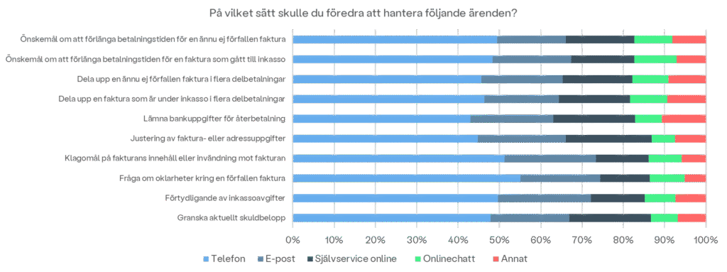 För samtliga ärendetyper är telefon den klart mest föredragna kanalen. I de flesta fall väljer över 50 % av respondenterna att hantera sitt ärende via telefon, oavsett om det gäller att förlänga betalningstid, ordna avbetalningsplan, få återbetalning eller ställa frågor om fakturor.
