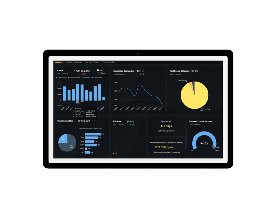 Ropo OneView™ omvandlar faktura- och betaldata till strategisk intelligens. Istället för att vänta på månadsrapporter får ekonomiavdelningen tillgång till realtidsinsikter om bland annat DSO-utveckling, betalningsförseningar och kunders betalningsbeteende.